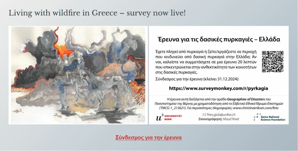 Η έρευνα αυτή διεξάγεται από την ομάδα Geographies of Disasters του Πανεπιστημίου της Βέρνης με χρηματοδότηση από το Ελβετικό Εθνικό Ίδρυμα Επιστημών (TMCG-1_213621). Για περισσότερες πληροφορίες: fires.giub@unibe.ch, www.christineeriksen.com/fires